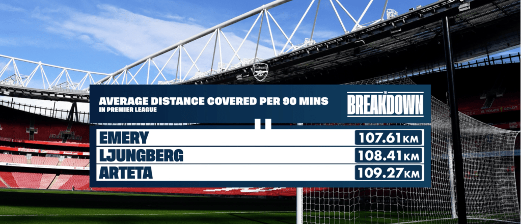 This is seen by the average distance covered per 90 minutes. Areta’s side with nearly 2 extra kilometers covered in a game over an Emery side. That may seem small when looking at the 109.27 covered by the team, but it’s the extra distance that is yielding better defensive results.