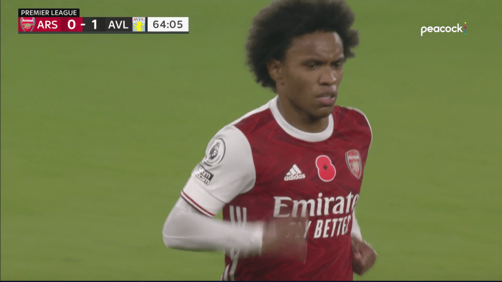 He made a complete hash of his pass back, leading to an Aston Villa break; his attempted block of a proceeding pass ended up being a lovely wall-pass to see Barkley through; and his haphazard defending ends with a Villa goal and his hands being thrown into the air. Maybe the only worse aspect than Willian’s involvement on the play is Rob Holding’s 1v.1 defending on Barkley….what is he doing? The whole play is a complete mess and Arsenal are down 1-0, 25 minutes in.