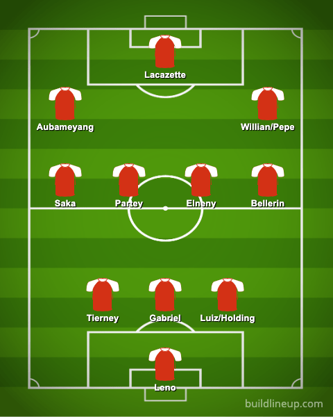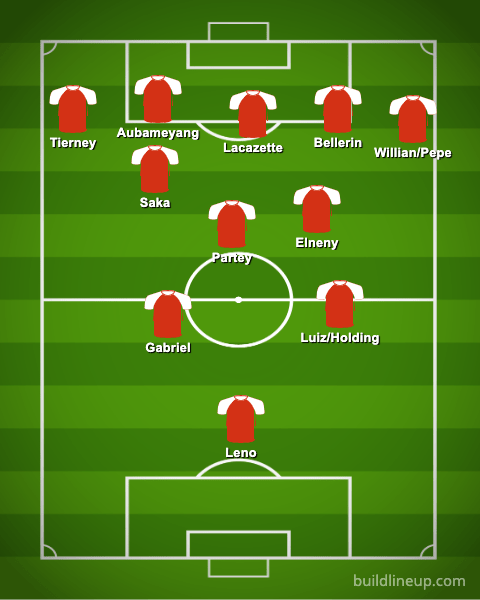 In the image above, I have Partey, the more gifted attacker in an Elneny-Partey pivot (although Elneny can pick and choose his moments), sitting in behind and joining the attack. Bellerin, Elneny, and Tierney form the defensive shield while the attacking front gets a little narrower to form their passing triangles. From here, Bellerin and Tierney could continue to look for opportunities to join wide from the midfield three.