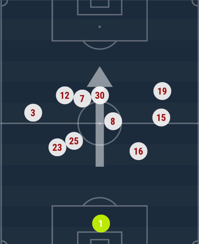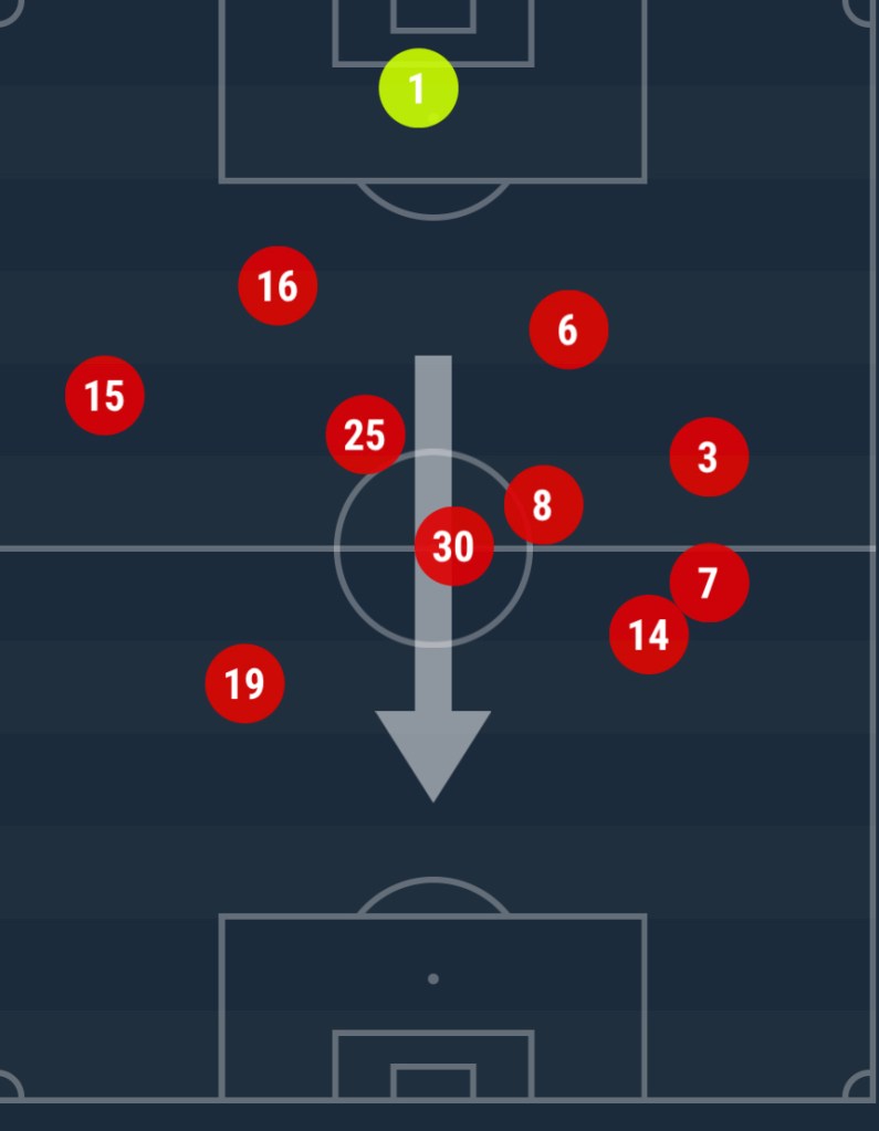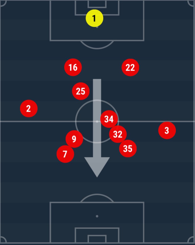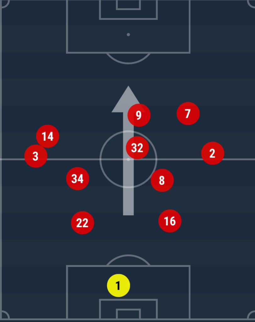 In the map we see two clusters in the attack — one on the right comprised of Smith Rowe (32), Lacazette (9), Saka (7), and Bellerin (2), and one on the left comprised of Xhaka (34), Tierney (3), and Aubameyang (14). There is seemingly a larger gap between the two that look like no man’s land, but I assure you that Smith Rowe’s movement does help close that distance in practice.